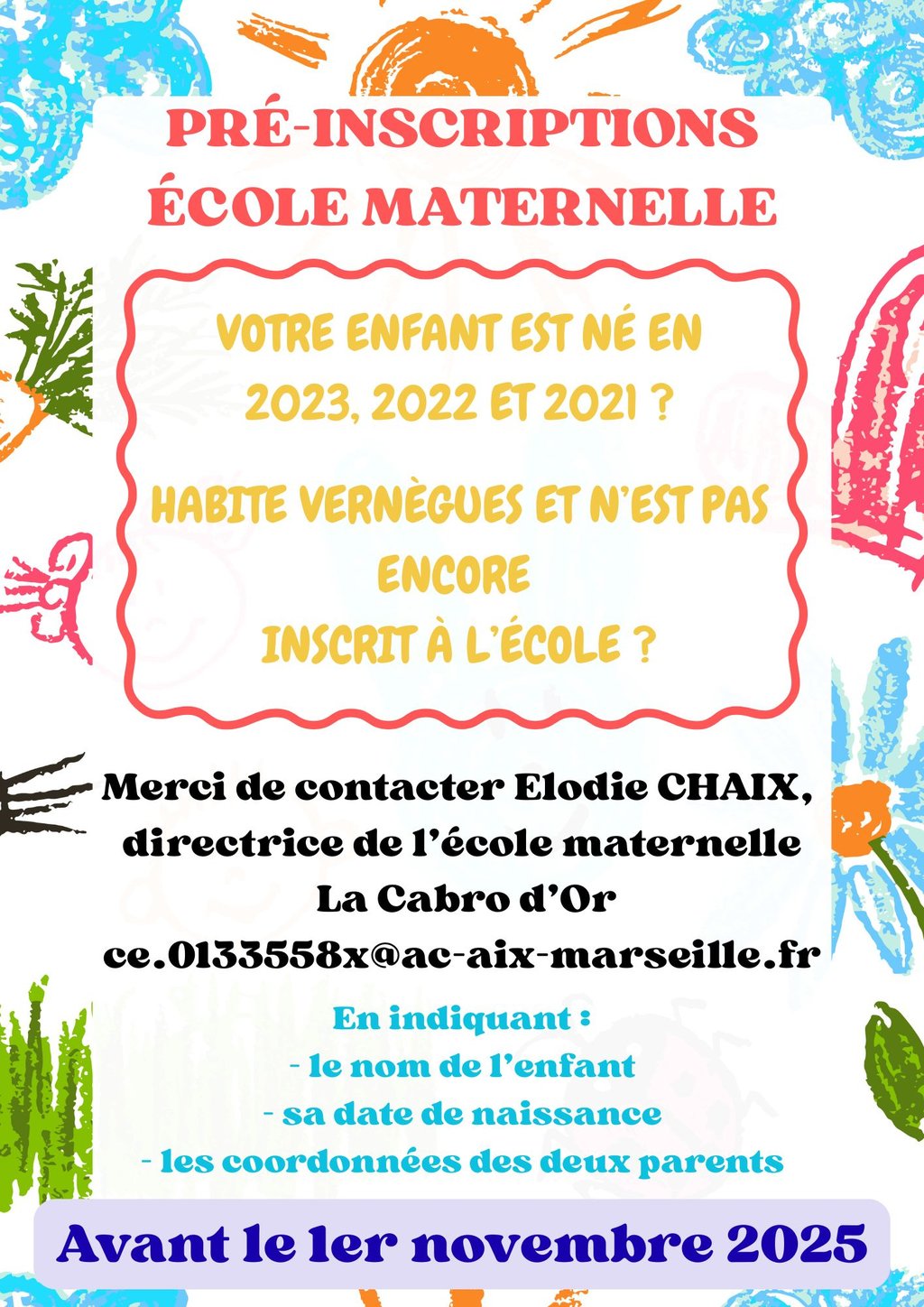 Merci de bien vouloir contacter Mme Elodie CHAIX, directrice de l'école maternelle, par mail 📧 ce.0133558x@ac-aix-marseille.fr et de lui indiquer :