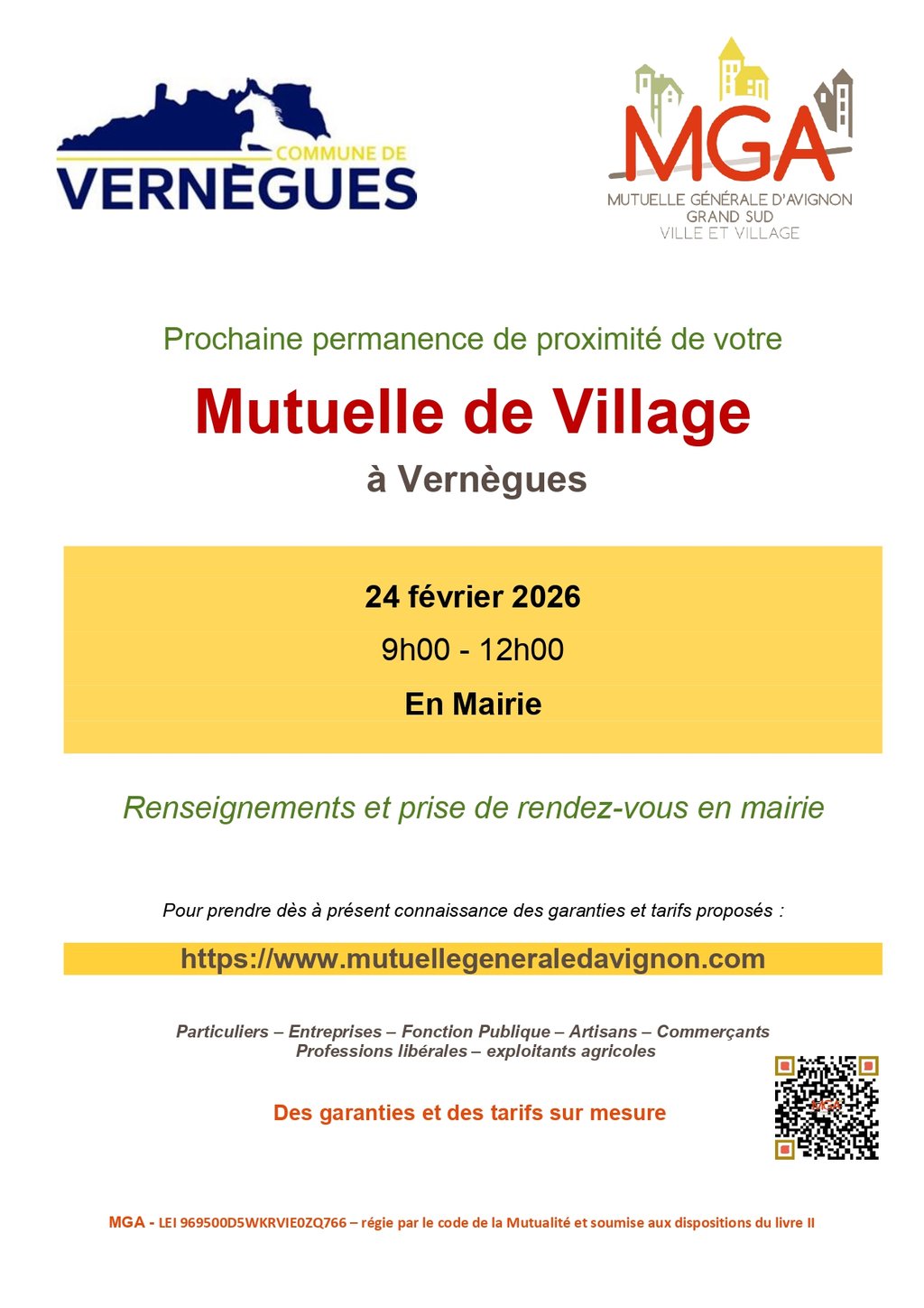 Parce que l’accès aux soins pour tous est une priorité, la commune de Vernègues a décidé de proposer à ses administrés et à ses agents une Mutuelle de Village, en partenariat avec la Mutuelle Générale d’Avignon Grand Sud (M.G.A.).