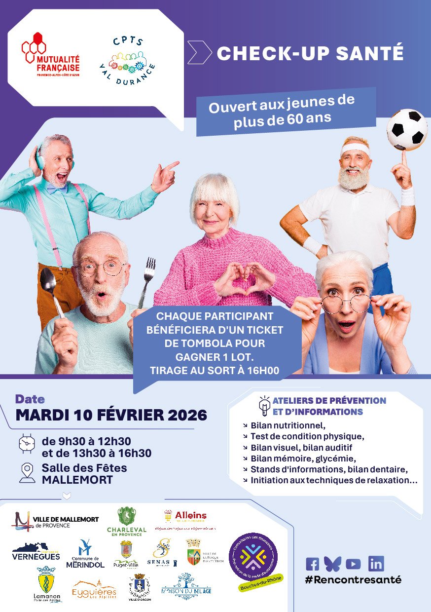 Les stands sont animés par des médecins, diététiciennes, kinésithérapeutes, podologue, infirmières, psychologue, ergothérapeutes en partenariat avec le groupement de la Mutualité Française, et avec le soutien des communes de notre CPTS : Vernègues, Cazan, Mallemort, Charleval, La Roque-d’Anthéron, Alleins, Lamanon, Eyguières, Mérindol, Puget, Sénas et Orgon.